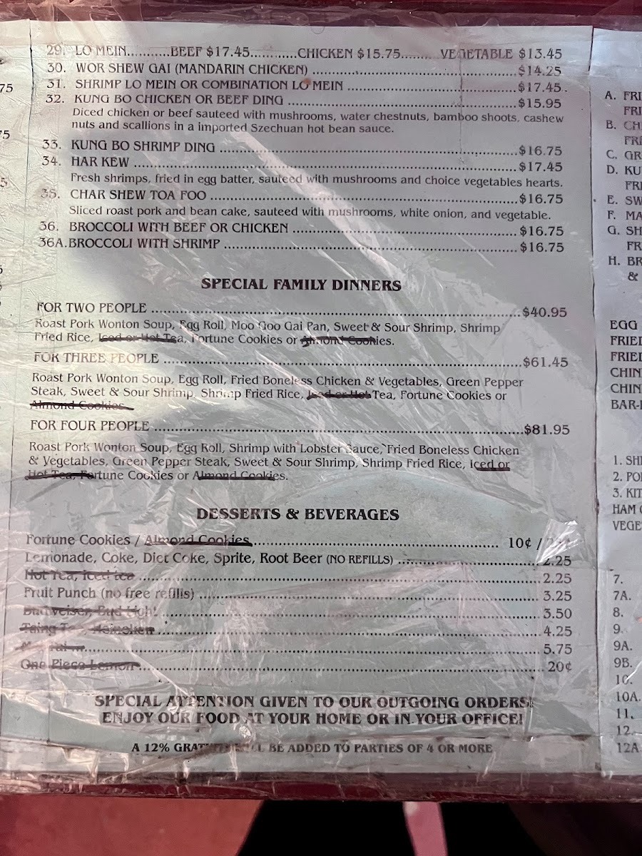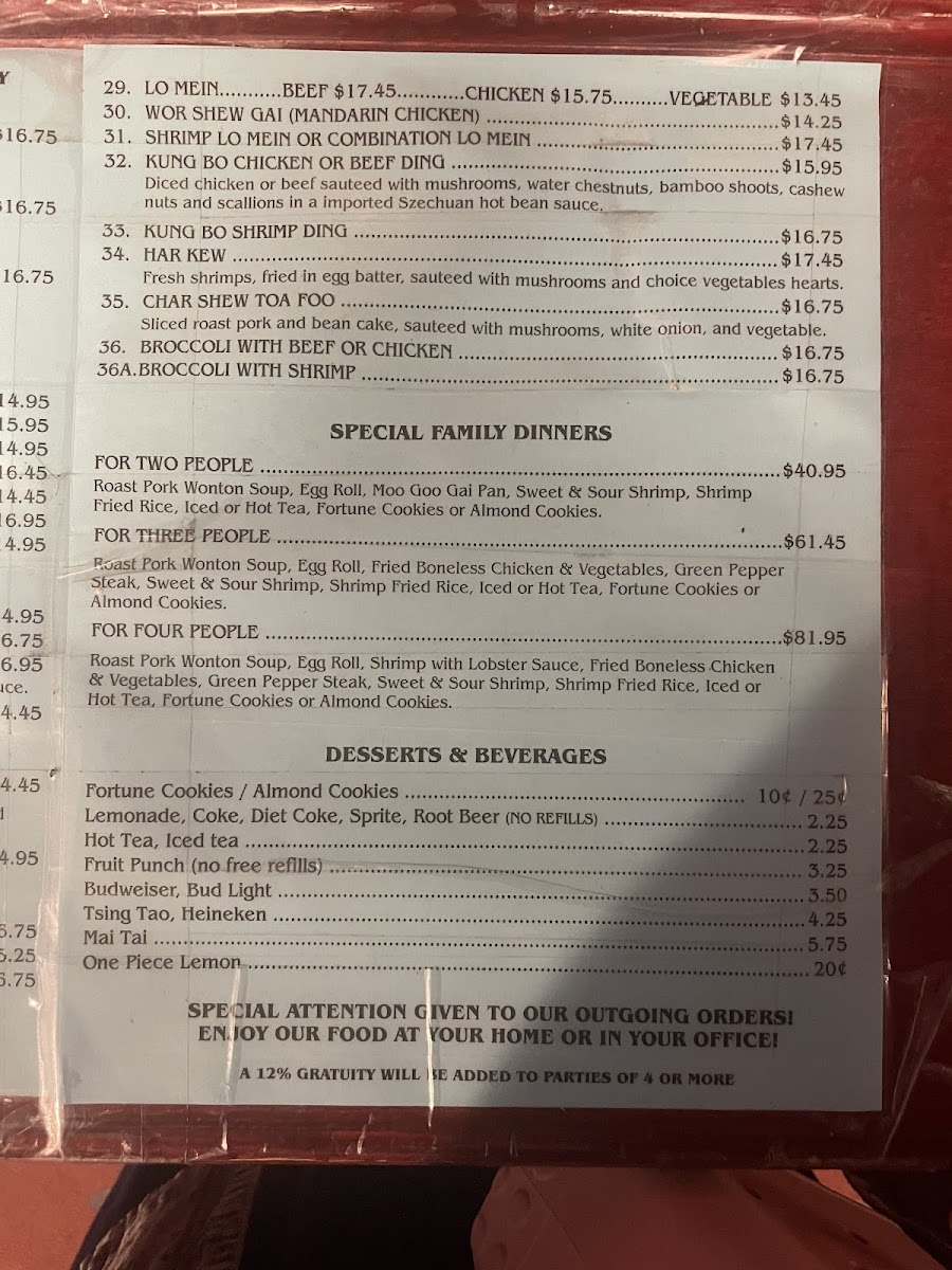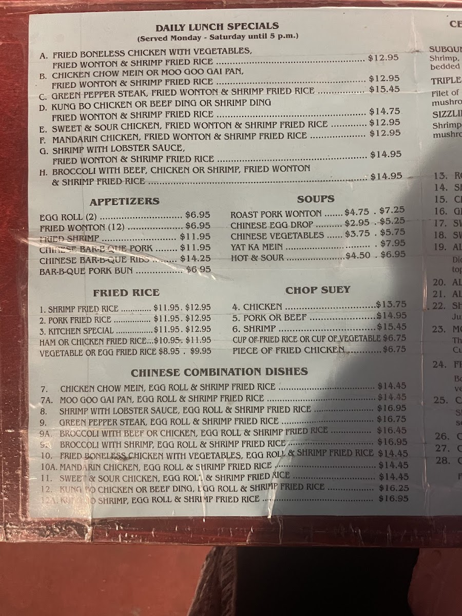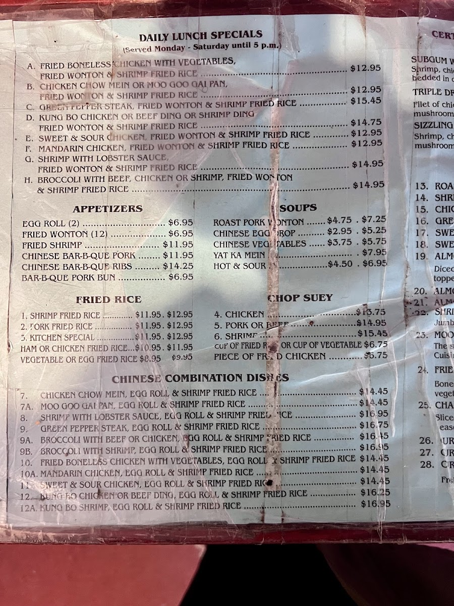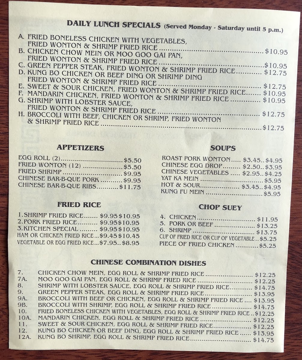 You can find hearty combo dishes like Broccoli with Chicken or Mandarin Chicken paired with egg rolls and shrimp fried rice, perfect for a satisfying midday meal. Soups such as Wonton and Egg Drop add warmth and balance, making them easy choices for lighter bites or when you prefer something soothing. The menu also includes a range of options like boneless fried chicken, ribs, and classic pepper steak that fit well with shared meals and leisurely evenings.